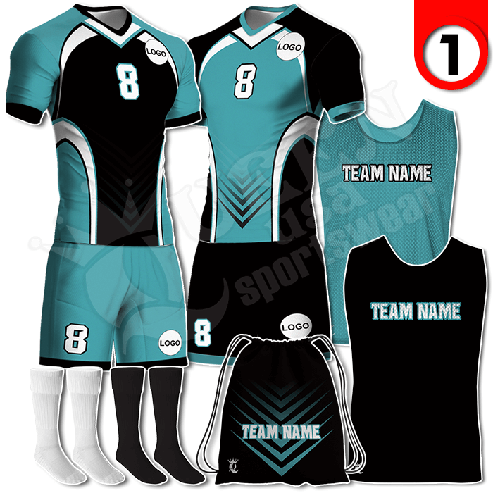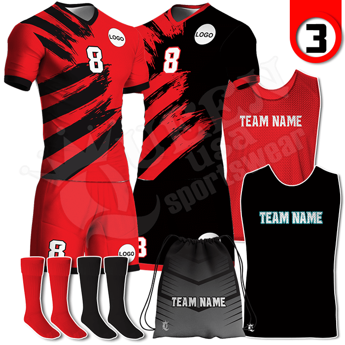 • The custom dye sublimated soccer uniforms with free logo and numbers (front, back and on the shorts)