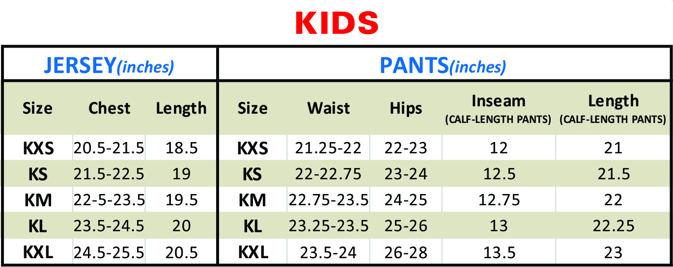 Size chart Baseball (Knicker Pants)